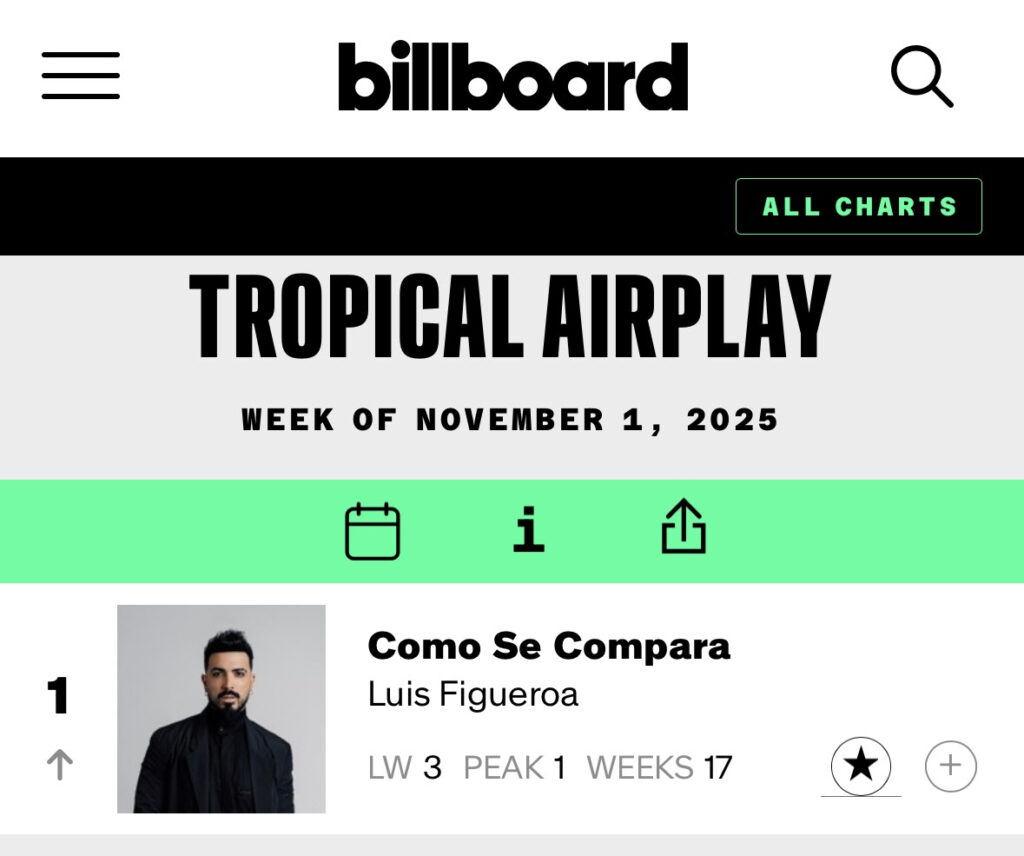 MIAMI, FL (martes, 29 de octubre de 2025):  El cantautor puertorriqueño Luis Figueroa suma otro logro a su trayectoria al alcanzar el #1 en el chart Billboard Tropical Airplay con su sencillo “Cómo Se Compara”, marcando el tercer #1 en su exitosa carrera. Con este hito, Figueroa reafirma su posición como una de las voces más importantes y consistentes del género, llevando la salsa a nuevas alturas dentro del panorama latino actual.